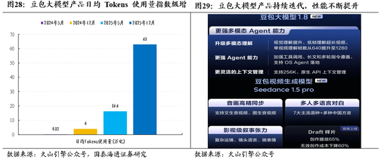 投资建议:AI应用产品性能跃升激发用户使用需求,国产大模型公司股权融资提速,AI应用产业规模有望加速增长,商业模式持续优化。Meta宣布完成对AI初创公司Manus的收购,交易对价超20亿美元,成为Meta史上第三大并购案;国产大模型公司MiniMax等启动港股上市招股,将陆续登陆港股市场;豆包大模型日均调用量已达到63万亿Tokens,保持全球前三和中国第一,呈指数级增长。从可用到好用,AI应用进入智能体发展阶段,有望在企业级市场率先规模化应用,多领域渗透率持续提升,逐步显现增收与降本效果,带动整体产业规模提升。